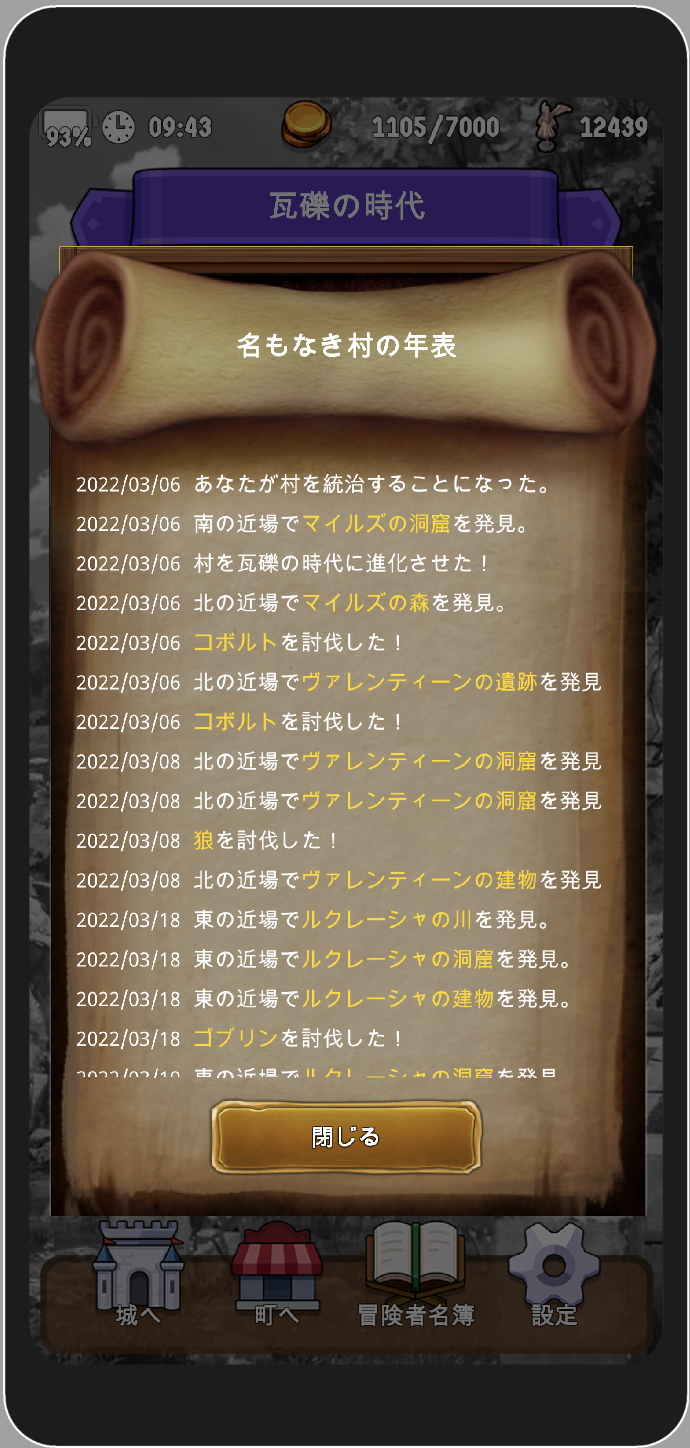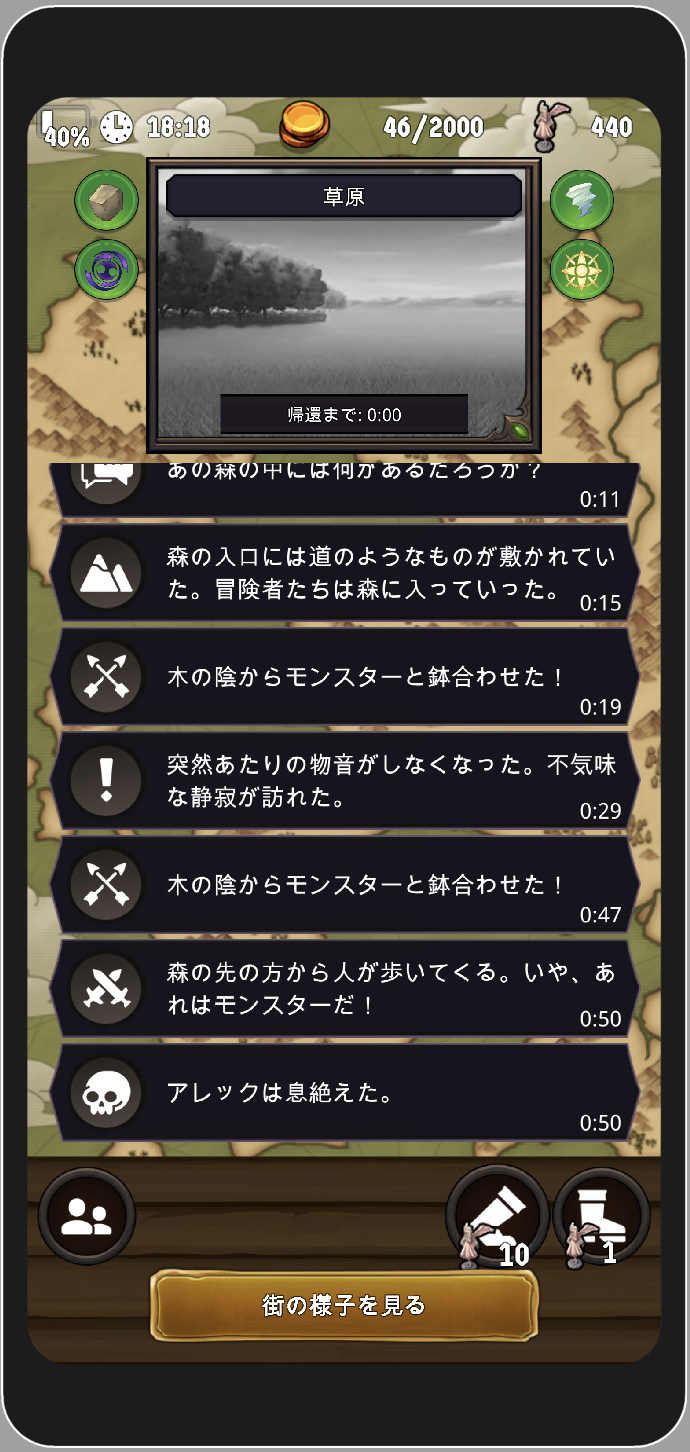 このゲームは冒険者たちを探索に出して、そこで得た報酬を使い村を発展させていくゲームです。