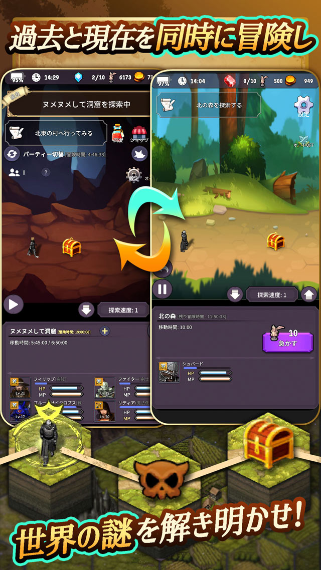 過去と現在のパーティーを切り替えながら冒険を進めていく放置系RPGです。