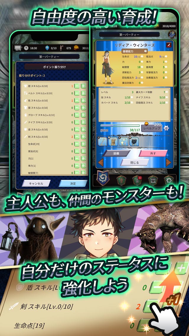 『人食い惑星3』は、武器や防具のカードを装備させ、エリアを自動で探索していく新感覚の放置型RPGです。