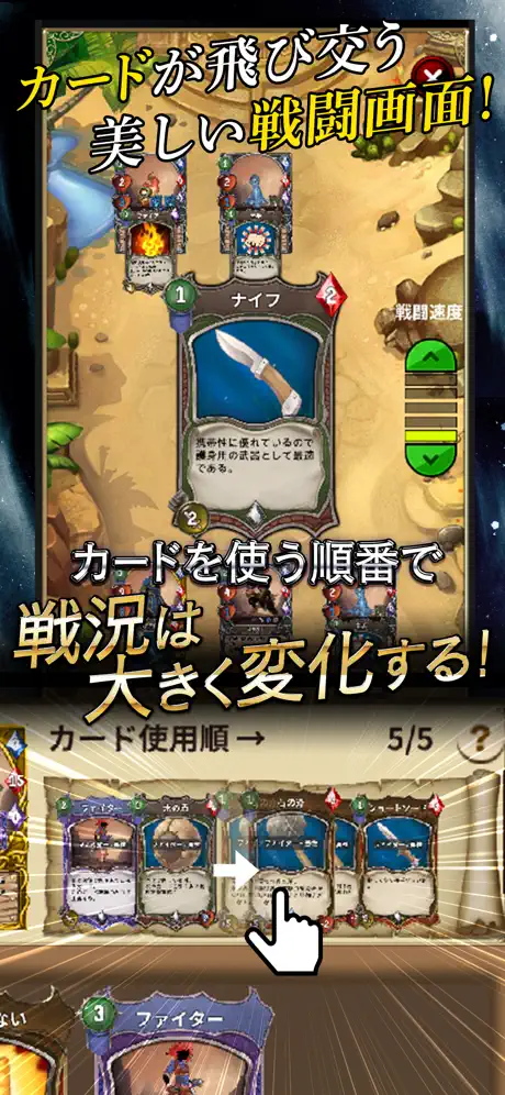 各キャラクターやモンスターは装備したカードを順番に使って敵と戦います。
